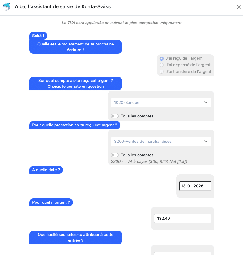 Pas tout à fait l’aise? Alba, notre assistant de saisie vous guide pas à pas pour une comptabilité correcte! Répondez aux questions de l’assistant et sauvez vos écritures comptables.