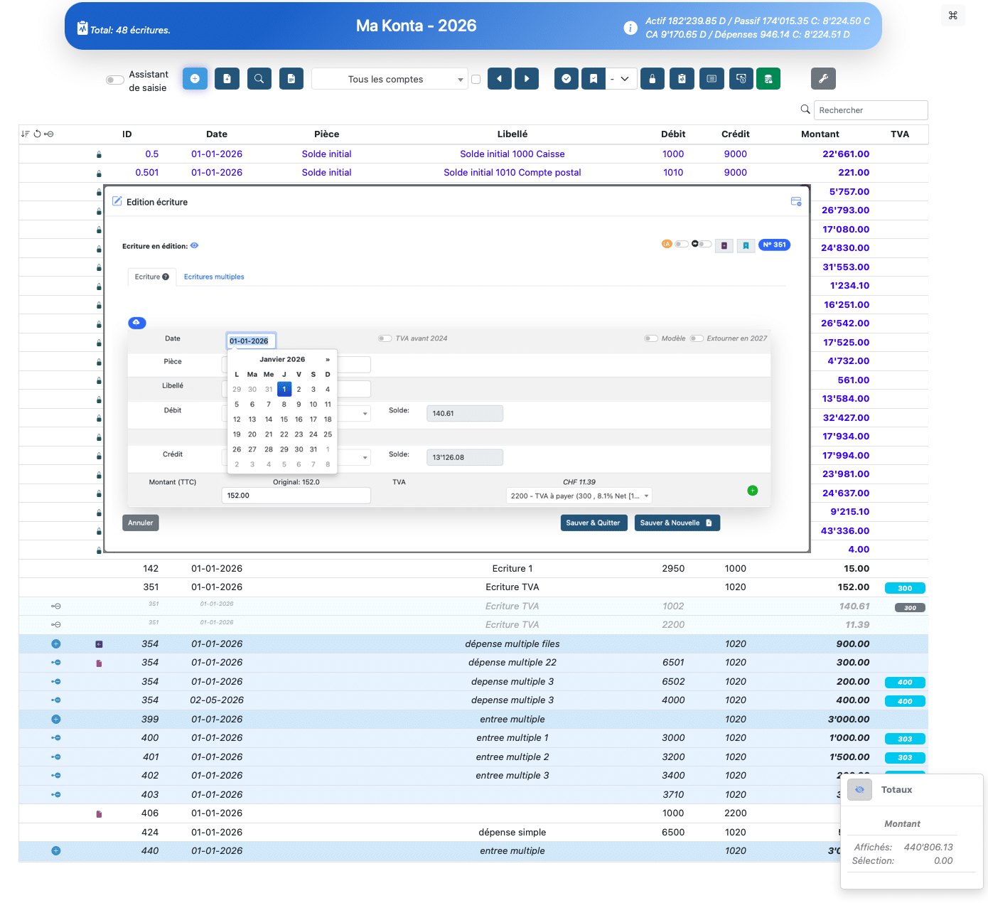 Vous contrôlez la situation et vous gardez toujours la main sur les automatismes. Une nouvelle entrée TVA: éditez la directement lors de l’écriture et sauvez-la. Un compte pas encore créé? Ajoutez-le sans quitter l’édition de l’écriture…